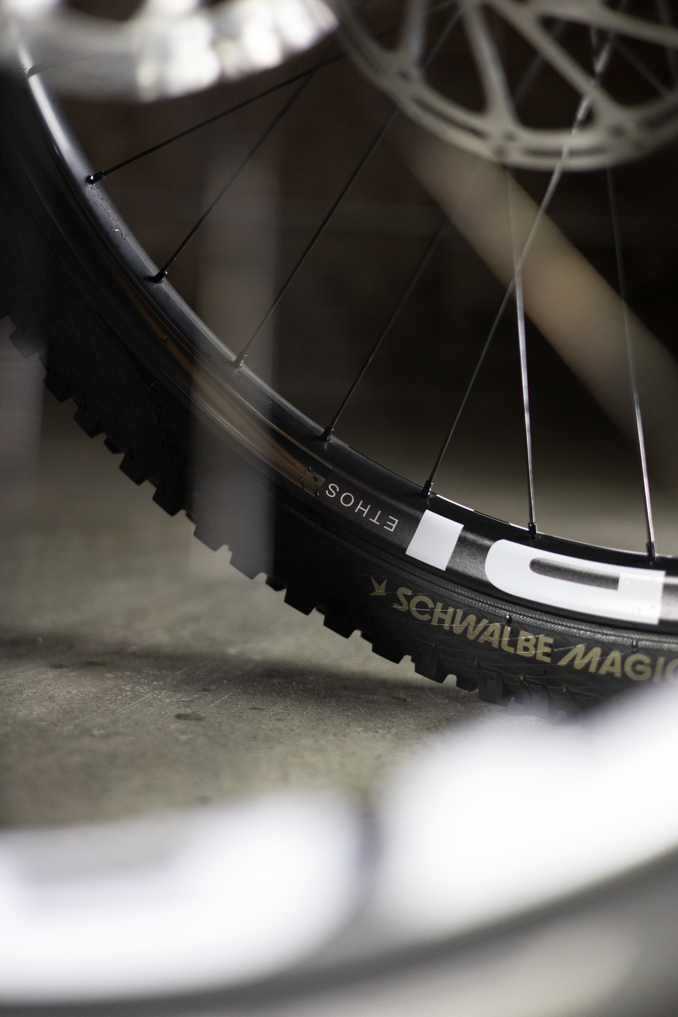 Berd spokes are the mainstay of the Ethos lineup, weighing less than half as much as steel spokes while offering higher tensile strength. Their primary advantage, however, is their material behaviour. The fibre construction absorbs vibrations, reducing trail feedback and improving traction.