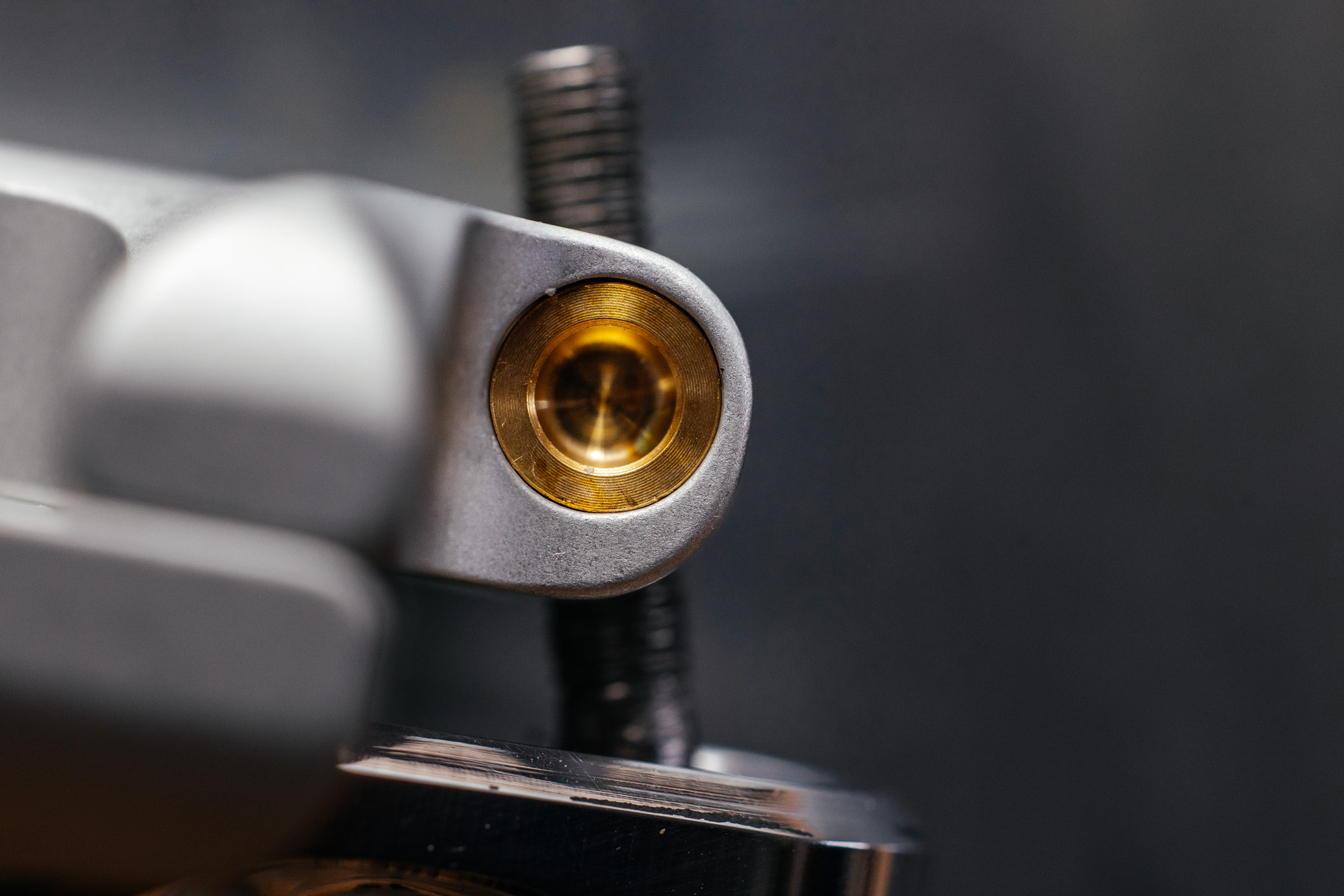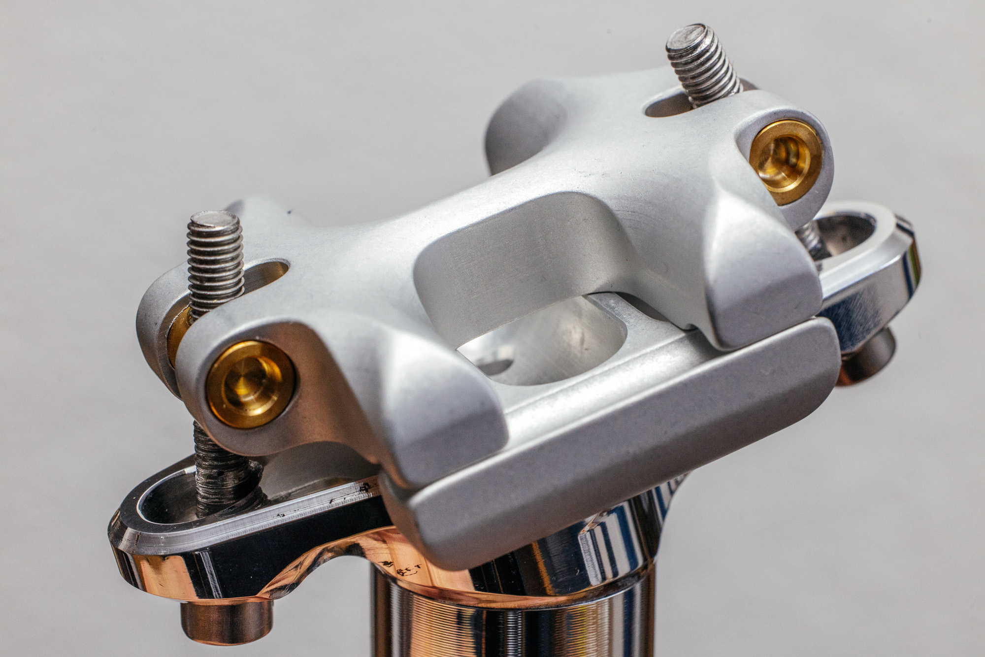 The two bolt-heads sit on spherical stainless-steel washers that allow them to pivot and self-align to the cradle. The top-clamp features two low-friction brass trunnions for super smooth and effortless tilt adjustment without binding.
