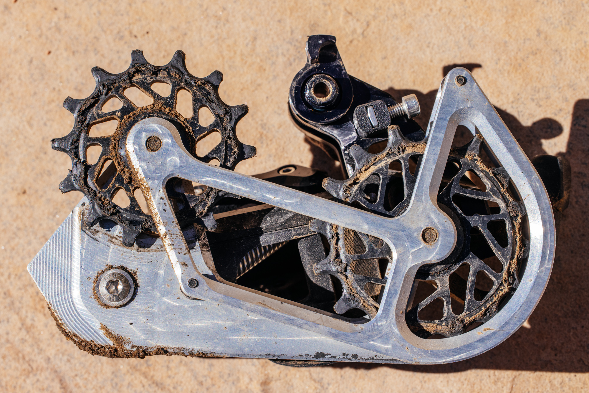 Then, longtime bike industry designer John Calendrille launched the Vivo Enduro derailleur with its completely rebuildable chassis and sealed bearing pivot points. This derailleur is pure sex but lacks replaceable fins to change its compatibility across drivetrains.