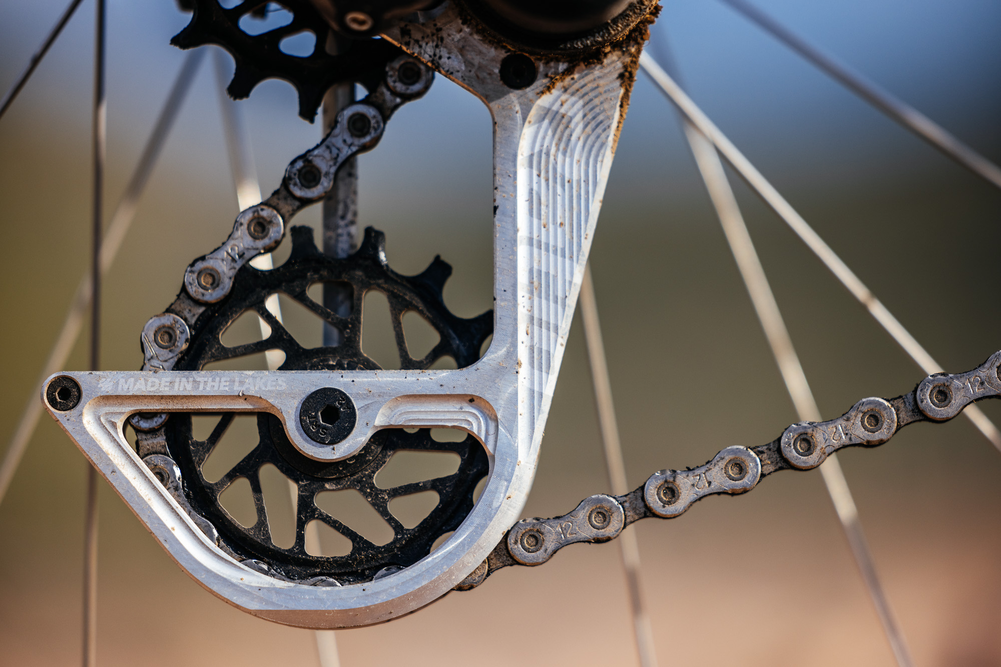 “There are a few reasons we went for larger jockeys in the Mech cage. Firstly, there’s wear (and its flip-side, efficiency). The larger jockey rotates at a lower rate for a given pedalling cadence/chain speed, so the jockey bearing lasts longer. Additionally, the articulation angle of each link around the jockey (360 / n, where n is the tooth count of the jockey) is smaller for a larger jockey, which is better for the chain. None of these effects are huge because the load on the chain is small on the slack side of the drivetrain as it passes around the jockeys, but they do count for something. Additionally, for the upper jockey, increasing the size means supporting a larger section of the chain along the length of the ‘B span’ between the jockey and the sprocket. We find that giving this span more lateral support as it disengages from the jockey improves shifting.”
