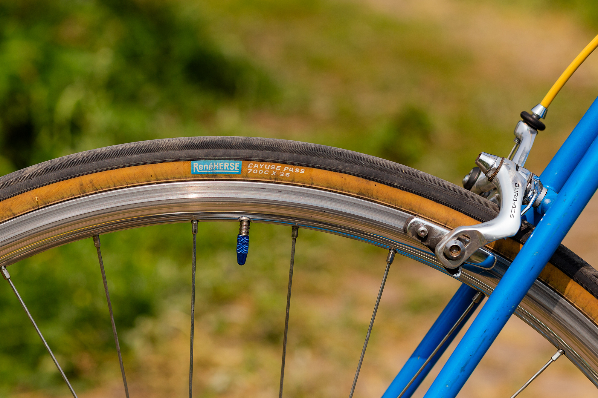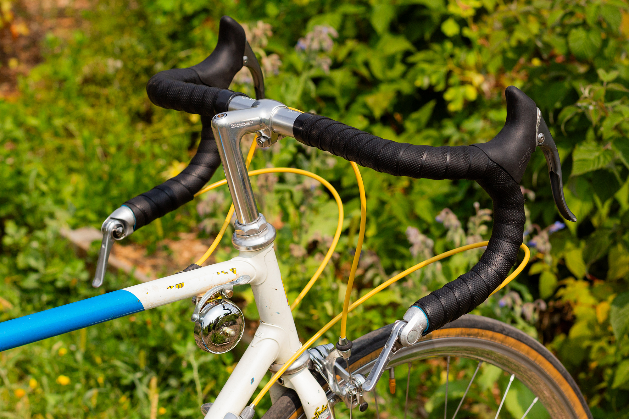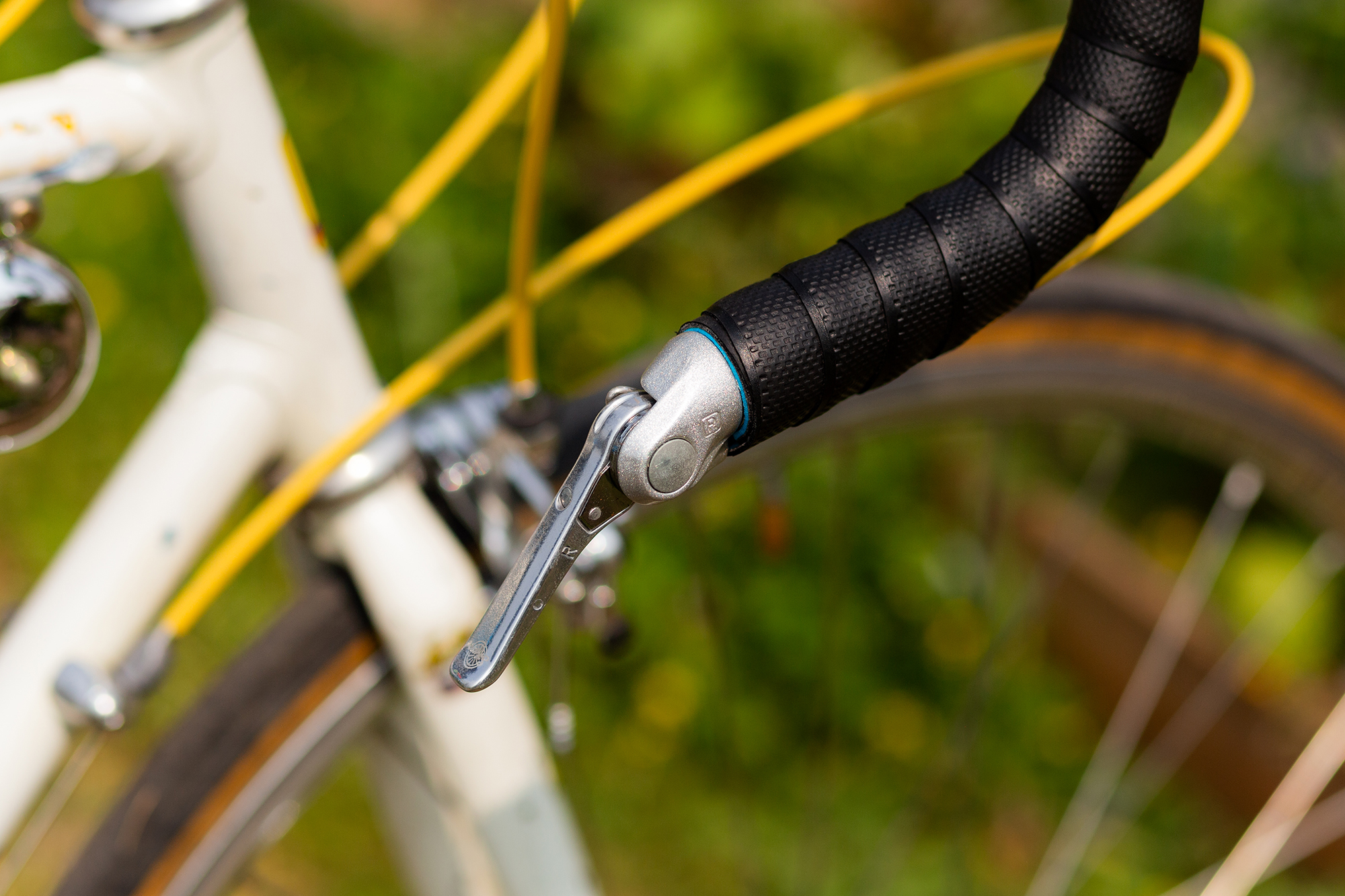 I mainly ride touring bikes, so a super-short Nitto Technomic and 44cm Noodle bars got me to the upright spot I wanted, along with moving the shifters up to the bar-ends with these Rivendell designed Dia-Compes. Tubular rims aren’t for me, but I think I got as close as I could with lightweight H Plus Son Archetypes and the smooth, smooth Rene Herse Cayuse Pass tires. I repurposed the old race number braze-on as a bell mount for my Crane Suzu.