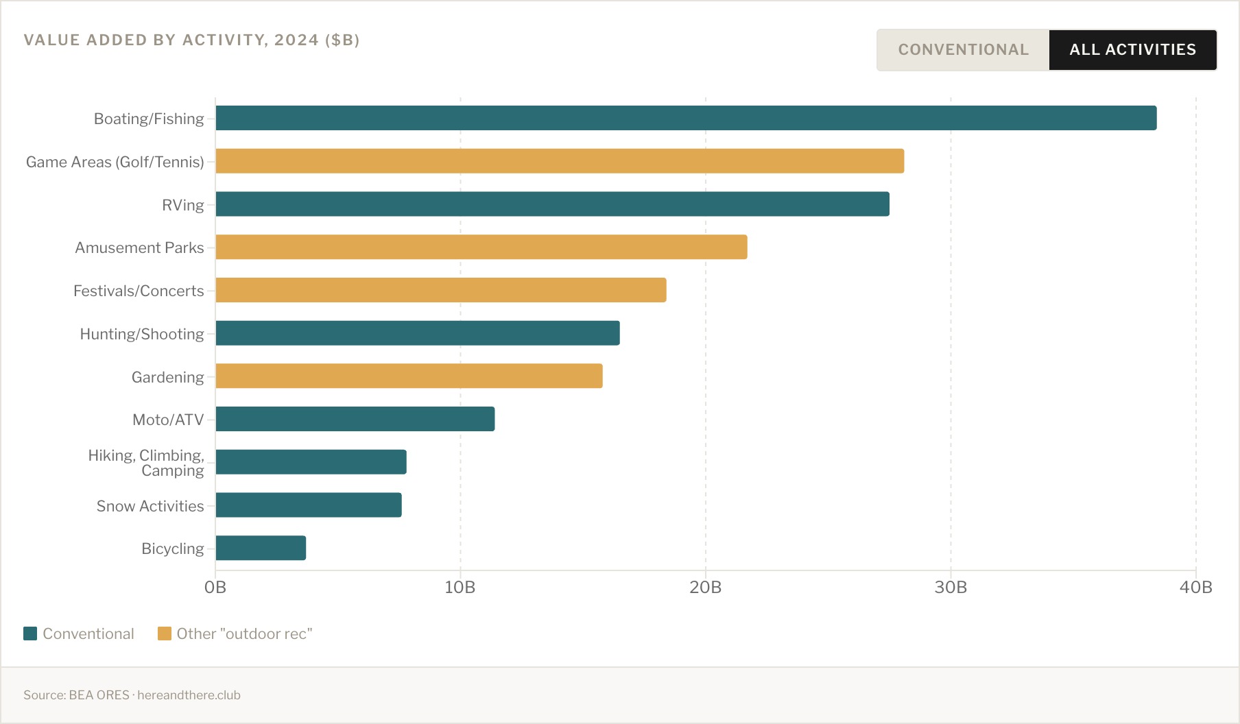 “Every year, the Bureau of Economic Analysis (BEA) puts out a report on the Outdoor Recreation Satellite Account (OREC), diving into the economic impact of the industry. This year’s headline is: $1.3 trillion in gross output, $696.7 billion in value added, 2.4% of GDP, 5.2 million jobs. Those are the numbers you’ll see in all the press releases and advocacy materials for the next 12 months. They’re real numbers, but they deserve a bit more context.”
